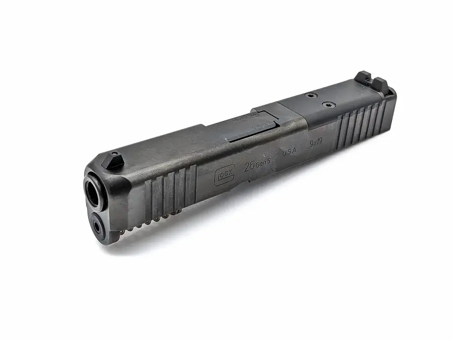 Factory Glock 26 Gen 5 MOS OEM complete slide  includes barrel, recoil spring assembly, internals, and factory sights. Drop-in ready for Glock 26 Gen 5 frames, MOS-ready for red-dot optics. Durable nDLC finish.